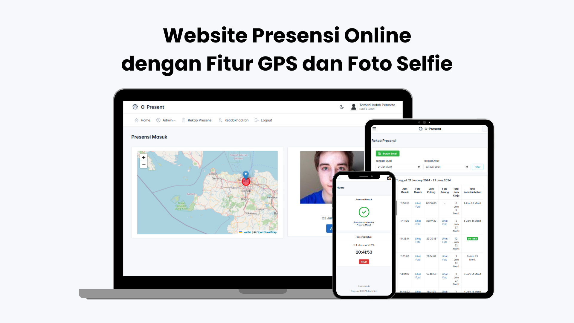 O-Present adalah aplikasi berbasis web yang dirancang untuk mencatat kehadiran secara online dengan mudah dan efisien GPS Real-time dan Foto Selfie.